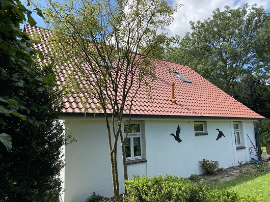 ln Dangastermoor haben wir 2021 ein altes Bauernhaus im Moor kernsaniert. Da das Haus im Innenbereich im Moor abgesackt war wurde innen eine neue Sohle auf neue Pfeiler gesetzt. Das ganze Haus wurde auf Strahlungswärme umgestellt. Das Dach wurde komplett erneuert. Hier wurde eine Aufsparrendämmung aus Holzweichfaserplatten und eine Zwischensparrendämmung aus Holzfasern verbaut. Eingedeckt wurde das Haus mit nicht engobierten Tonziegeln. Es wurde mit mineralischen Dämmplatten von innen gedämmt und mit Lehm verputzter Wandheizung versehen. Die Fensteröffnungen wurden teilweise nach historischem Vorbild wieder hergestellt oder auf Kundenwunsch verändert. Hier wurden auswärts schlagende Holzfenster und Holztüren von Vrogum (www.vr-sv.com) eingesetzt. Die Tür zum Garten ist eine sogenannte "Klöntür". Die Wände wurden in Eigenleistung mit Lehmfarbe gefinisht. Teilweise ist der braune Lehmgrundputz in Sicht erhalten geblieben.